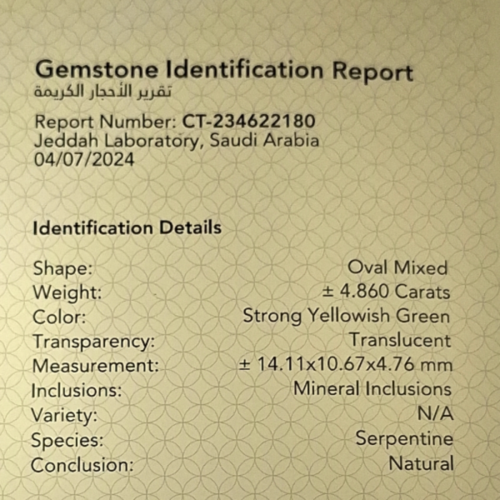 اسم الحجر : حجر سربنتين طبيعي موثق و مفحوص بشهادة مختبر وزن الحجر : 4.860 قيراط قص الحجر : Oval Mixed هل يوجد أي معالجة حسب تقرير المختبر: طبيعي 100% مصدر شهادة المختبر : MT